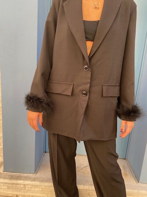 tailleur nero con dettaglio piuma alla manica e giacca oversize